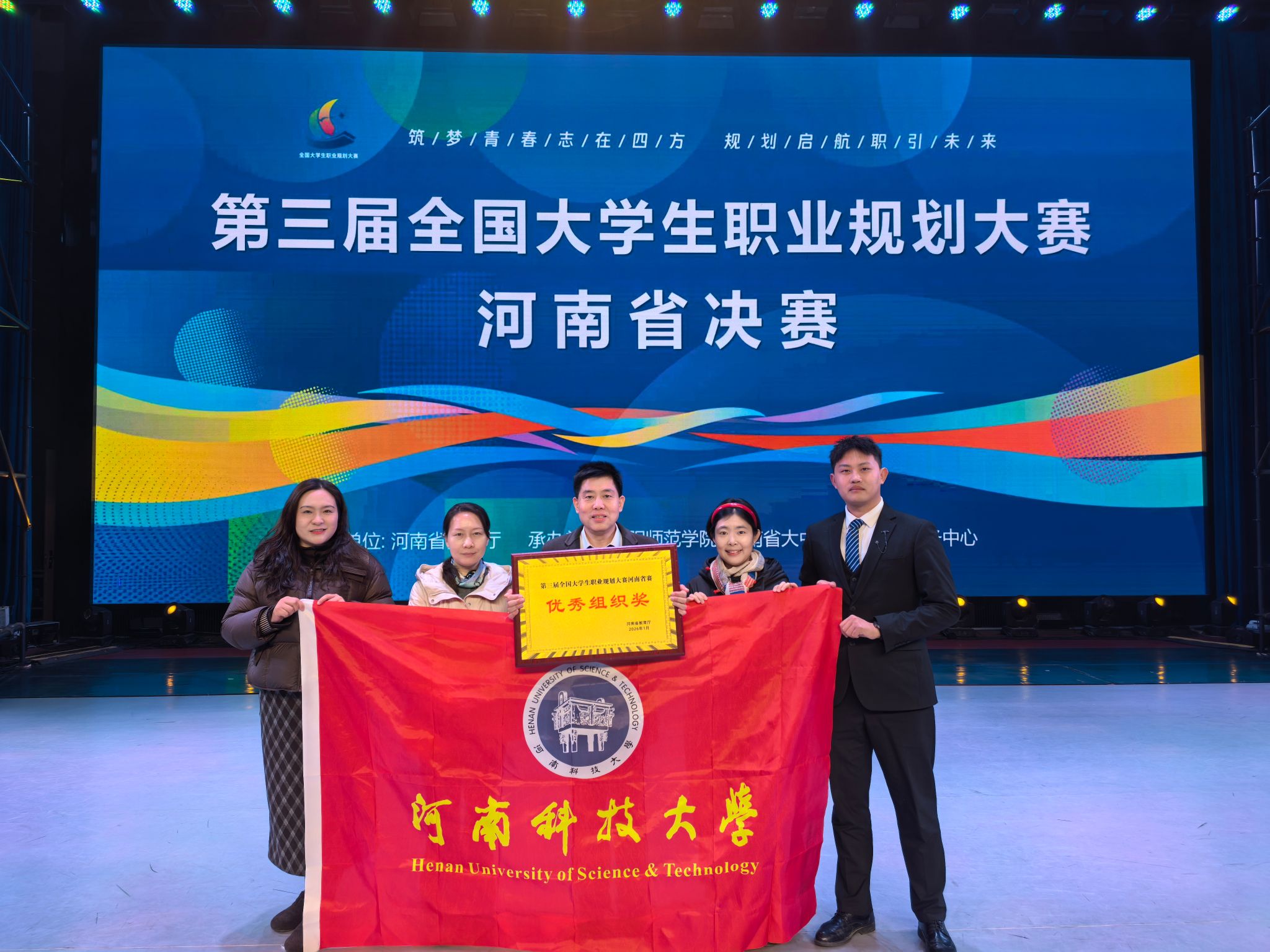 近日,第三届全国大学生职业规划大赛河南省决赛圆满落幕。我校选手斩获金奖7项、银奖3项、铜奖2项,金奖数量及获奖总量均居全省高校首位,我校以第一位次荣获“优秀组织奖”。 大赛以“筑梦青春志在四方,规划启航职引未来”为主题,设置成长赛道和就业赛道。决赛现场,经主题陈述、评委提问(综合面试)、天降offer等环节的激烈角逐,最终,土木建筑学院李帅帅等7人荣获金奖,材料科学与工程学院梁严方等3人荣获银奖,动物科技学院徐含等2人荣获铜奖。 自2025年10月份大赛启动以来,学校高度重视、广泛动员,共有4.6万余名学生参赛。大赛期间,学校积极搭建多维平台,持续优化生涯教育与就业指导服务,精心组织专题培训、生涯嘉年华、就业创业论坛等系列活动,多措并举助力学生提升就业竞争力,推动实现更高质量就业。